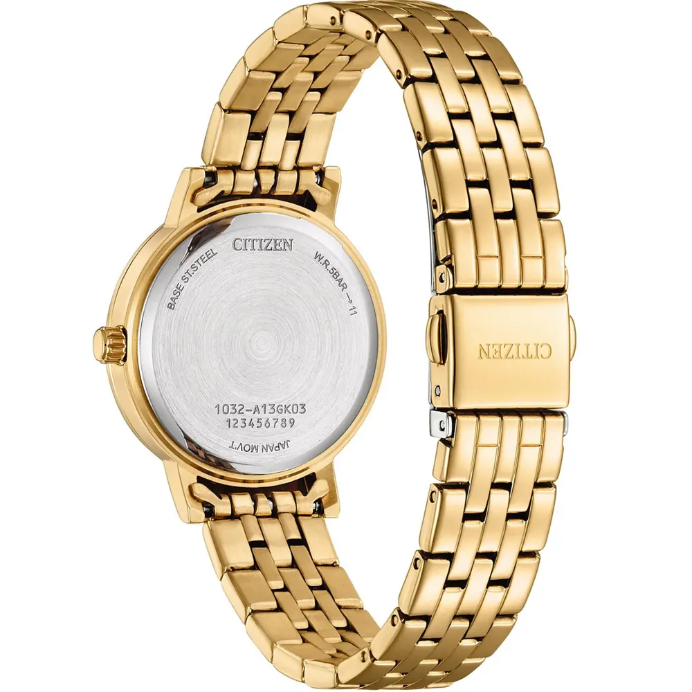 Citizen EL3103-57D Metal Band Women Watch. The case is made out of gold stainless steel with a gold bezel, which stands for the high quality of the item, it has a mother of pearl color dial. This model has got 50 meters of water resistance. it can be worn in scenarios where it is likely to be splashed but not immersed in water and will be fine in rain. The watch is shipped with an original box and a guarantee from the manufacturer.