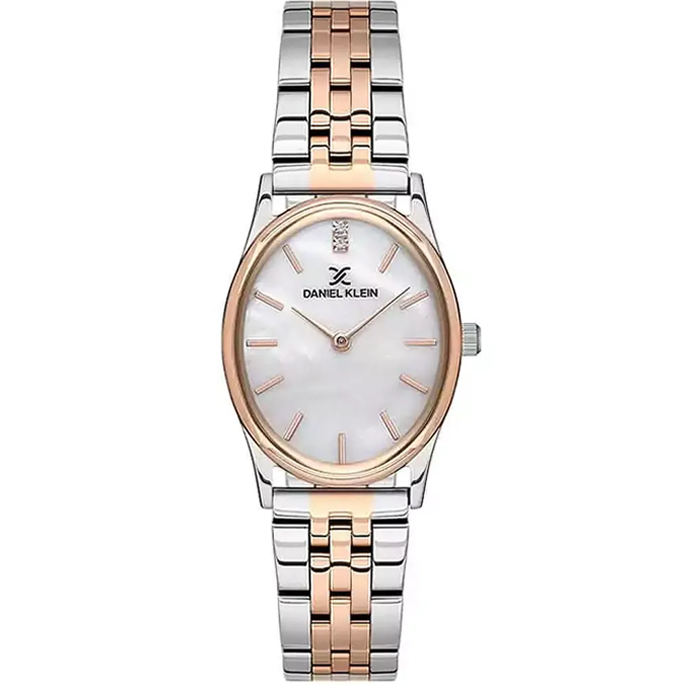 Daniel Klein DK13606-5 Metal Band Women Watch. The case is made out of silver brass with a rose gold bezel, which stands for the high quality of the item, it has a mother of pearl color dial. This model has got 30 meters of water resistance. it can be worn in scenarios where it is likely to be splashed but not immersed in water and will be fine in rain. The watch is shipped with an original box and a guarantee from the manufacturer.
