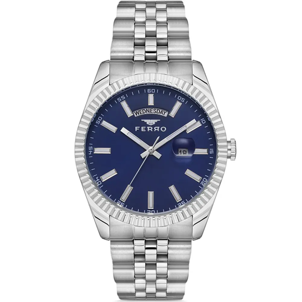 Ferro F11247A-A3 Metal Band Men Watch. The case is made out of silver super metal with a silver bezel, which stands for the high quality of the item, it has a blue color dial. This model has got 30 meters of water resistance. it can be worn in scenarios where it is likely to be splashed but not immersed in water and will be fine in rain. The watch is shipped with an original box and a guarantee from the manufacturer.