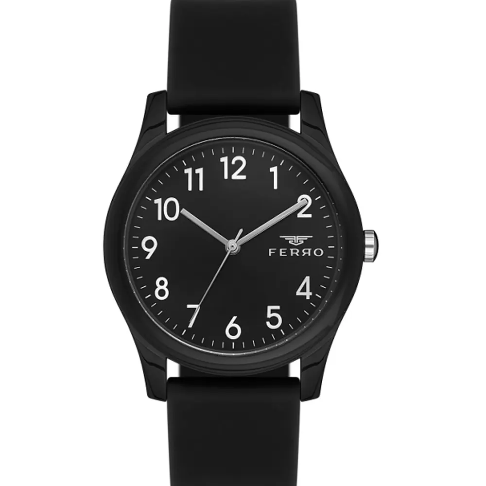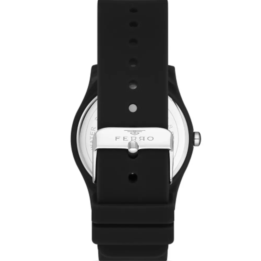 Ferro F11342D-G Rubber Band Men Watch . The case is made out of black super metal with a black bezel, which stands for the high quality of the item, it has a black color dial. This model has got 30 meters of water resistance. it can be worn in scenarios where it is likely to be splashed but not immersed in water and will be fine in rain. The watch is shipped with an original box and a guarantee from the manufacturer.