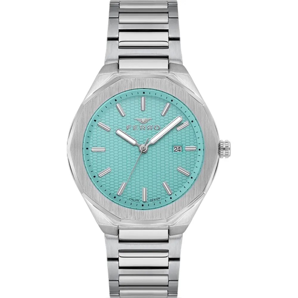 Ferro F11535A-A15 Metal Band Men Watch. The case is made out of silver super metal with a silver bezel, which stands for the high quality of the item, it has a sky blue color dial. This model has got 30 meters of water resistance. it can be worn in scenarios where it is likely to be splashed but not immersed in water and will be fine in rain. The watch is shipped with an original box and a guarantee from the manufacturer.