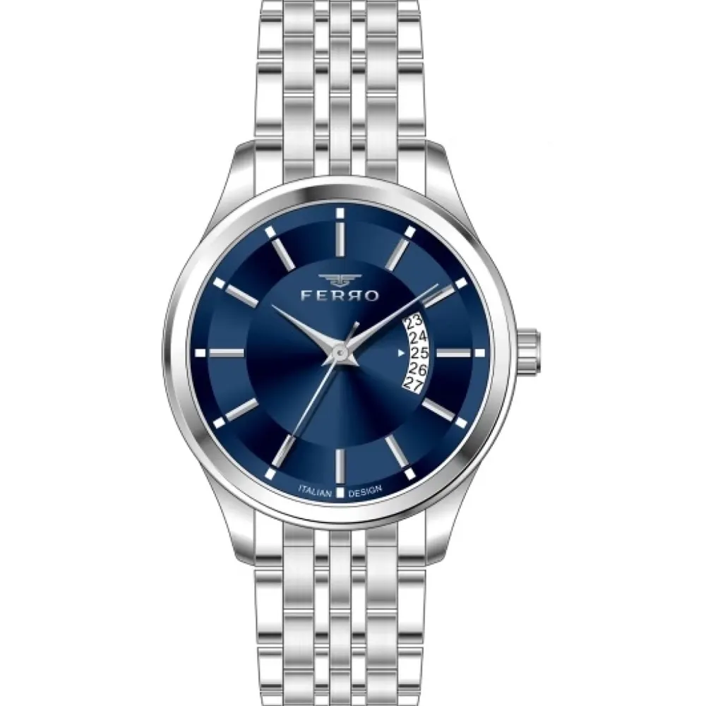 Ferro F11561A-A3 Metal Band Men Watch. The case is made out of silver super metal with a silver bezel, which stands for the high quality of the item, it has a blue color dial. This model has got 30 meters of water resistance. it can be worn in scenarios where it is likely to be splashed but not immersed in water and will be fine in rain. The watch is shipped with an original box and a guarantee from the manufacturer.
