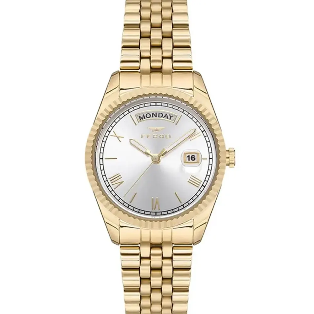 Ferro F21131A-B Metal Band Women Watch. The case is made out of gold super metal with a gold bezel, which stands for the high quality of the item, it has a silver color dial. This model has got 30 meters of water resistance. it can be worn in scenarios where it is likely to be splashed but not immersed in water and will be fine in rain. The watch is shipped with an original box and a guarantee from the manufacturer.