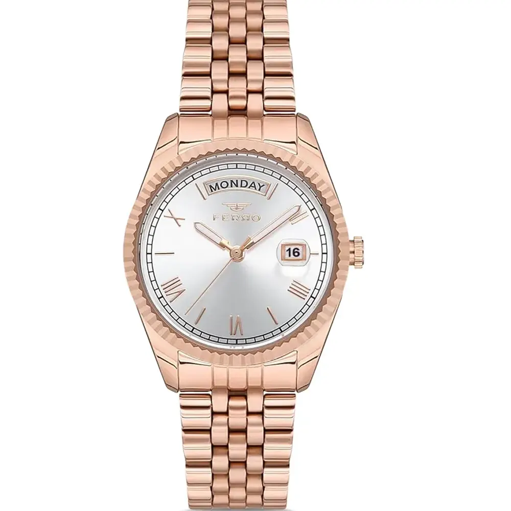 Ferro F21131A-C Metal Band Women Watch . The case is made out of rose gold super metal with a rose gold bezel, which stands for the high quality of the item, it has a silver color dial. This model has got 30 meters of water resistance. it can be worn in scenarios where it is likely to be splashed but not immersed in water and will be fine in rain. The watch is shipped with an original box and a guarantee from the manufacturer.