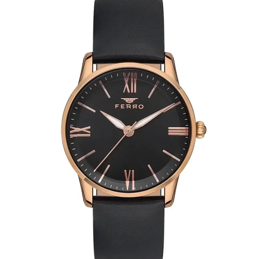Ferro F21182B-R Leather Band Women Watch . The case is made out of rose gold super metal with a rose gold bezel, which stands for the high quality of the item, it has a black color dial. This model has got 30 meters of water resistance. it can be worn in scenarios where it is likely to be splashed but not immersed in water and will be fine in rain. The watch is shipped with an original box and a guarantee from the manufacturer.