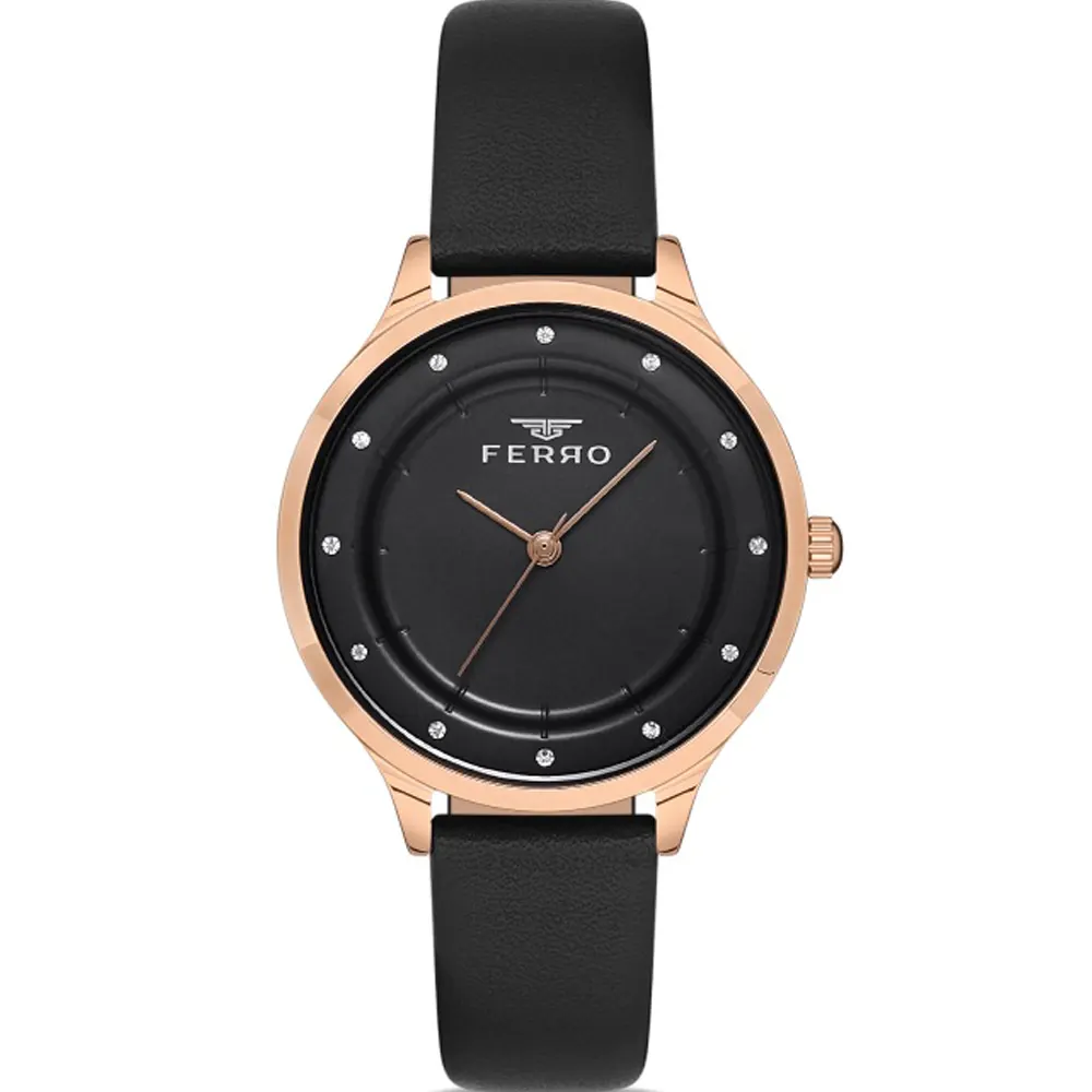 Ferro F21191B-R Leather Band Women Watch. The case is made out of rose gold super metal with a rose gold bezel, which stands for the high quality of the item, it has a black color dial. This model has got 30 meters of water resistance. it can be worn in scenarios where it is likely to be splashed but not immersed in water and will be fine in rain. The watch is shipped with an original box and a guarantee from the manufacturer.