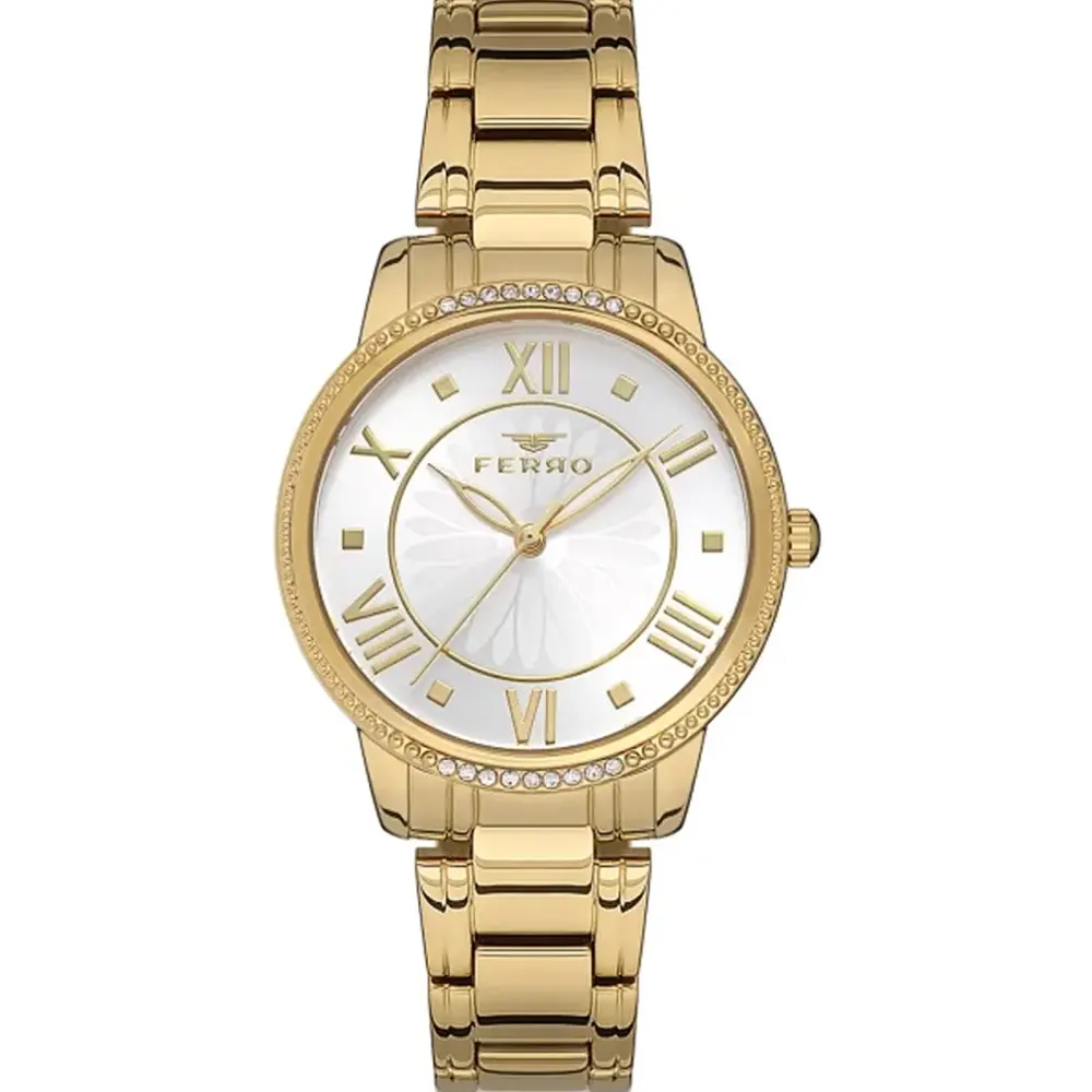 Ferro F21925A-B Metal Band Women Watch. The case is made out of gold super metal with a gold bezel, which stands for the high quality of the item, it has a silver color dial. This model has got 30 meters of water resistance. it can be worn in scenarios where it is likely to be splashed but not immersed in water and will be fine in rain. The watch is shipped with an original box and a guarantee from the manufacturer.