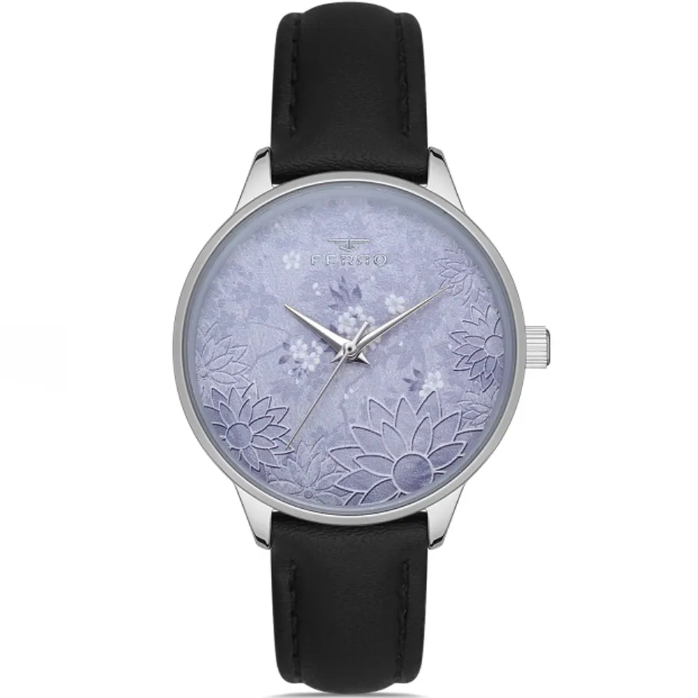 Ferro F40081-01 Leather Band Women Watch. The case is made out of silver super metal with a silver bezel, which stands for the high quality of the item, it has a light purple color dial. This model has got 30 meters of water resistance. it can be worn in scenarios where it is likely to be splashed but not immersed in water and will be fine in rain. The watch is shipped with an original box and a guarantee from the manufacturer.