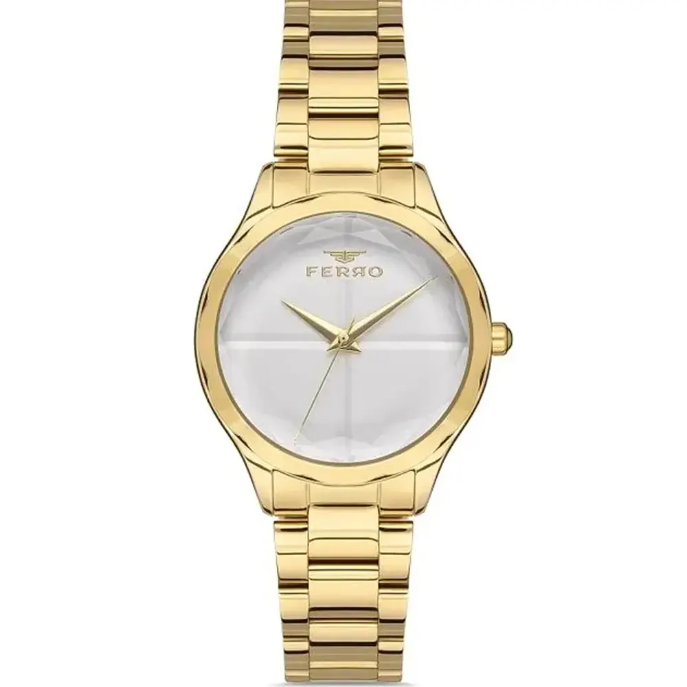 Ferro FL21250A-B Metal Band Women Watch. The case is made out of gold super metal with a gold bezel, which stands for the high quality of the item, it has a silver dial. This model has got 30 meters of water resistance. it can be worn in scenarios where it is likely to be splashed but not immersed in water and will be fine in rain. The watch is shipped with an original box and a guarantee from the manufacturer.