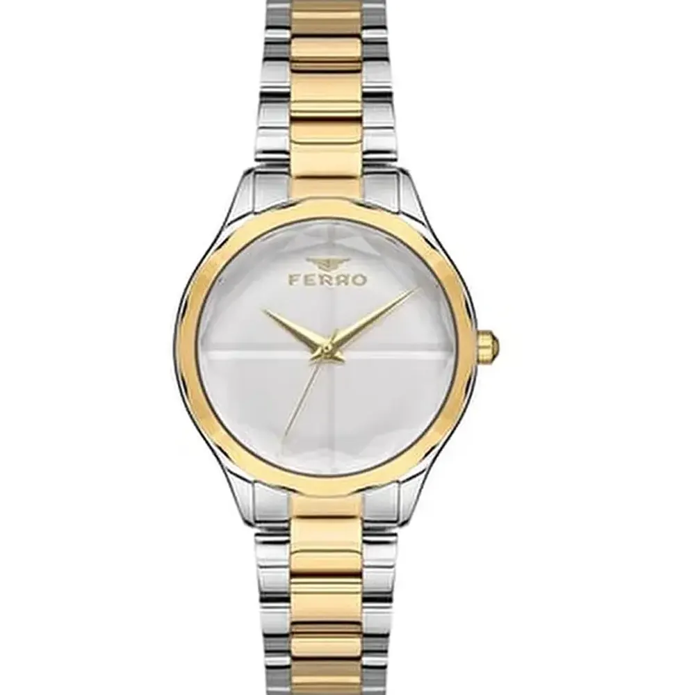 Ferro FL21250A-D Metal Band Women Watch. The case is made out of silver super metal with a gold bezel, which stands for the high quality of the item, it has a silver color dial. This model has got 30 meters of water resistance. it can be worn in scenarios where it is likely to be splashed but not immersed in water and will be fine in rain. The watch is shipped with an original box and a guarantee from the manufacturer.