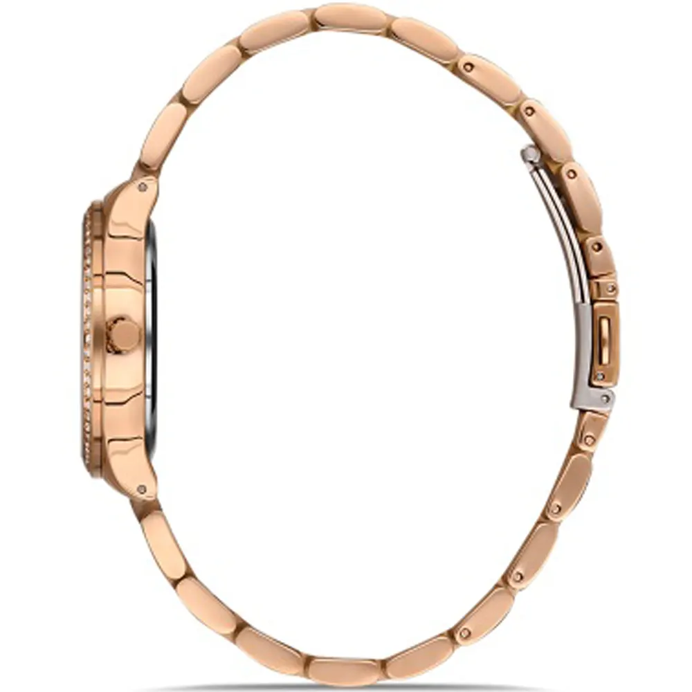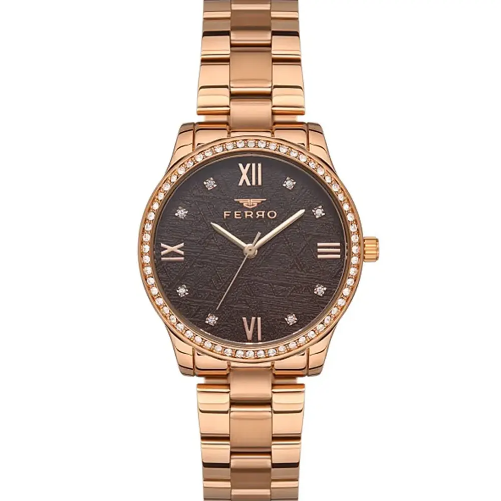 Ferro FL21271A-C6 Metal Band Women Watch . The case is made out of rose gold super metal with a rose gold bezel, which stands for the high quality of the item, it has a brown color dial. This model has got 30 meters of water resistance. it can be worn in scenarios where it is likely to be splashed but not immersed in water and will be fine in rain. The watch is shipped with an original box and a guarantee from the manufacturer.