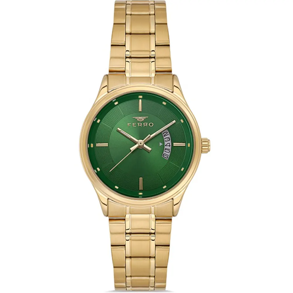 Ferro FL21464A-B6 Metal Band Women Watch. The case is made out of gold super metal with a gold bezel, which stands for the high quality of the item, it has a green color dial. This model has got 30 meters of water resistance. it can be worn in scenarios where it is likely to be splashed but not immersed in water and will be fine in rain. The watch is shipped with an original box and a guarantee from the manufacturer.