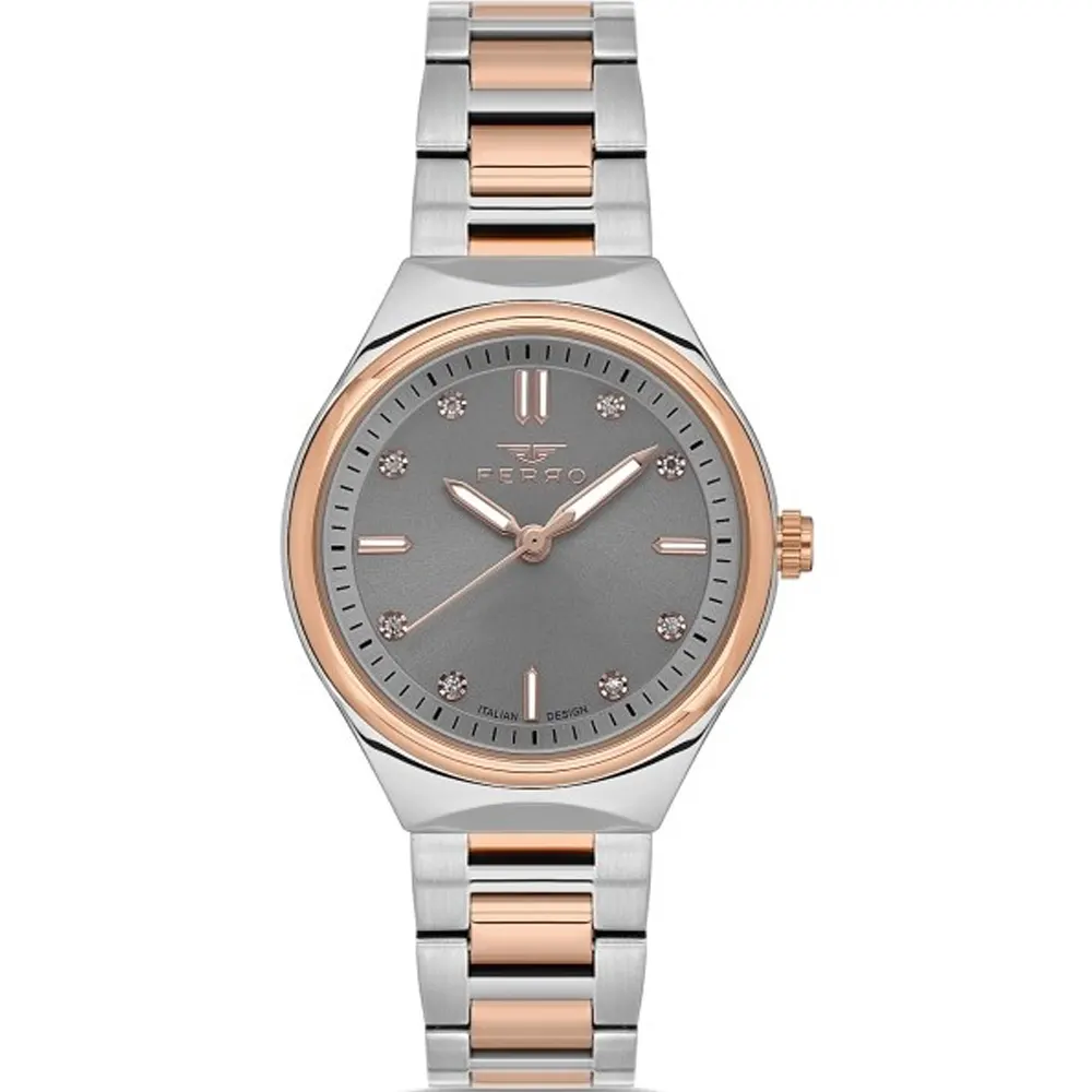 Ferro FL21477A-D6 Metal Band Women Watch. The case is made out of silver super metal with a rose gold bezel, which stands for the high quality of the item, it has a grey color dial. This model has got 30 meters of water resistance. it can be worn in scenarios where it is likely to be splashed but not immersed in water and will be fine in rain. The watch is shipped with an original box and a guarantee from the manufacturer.