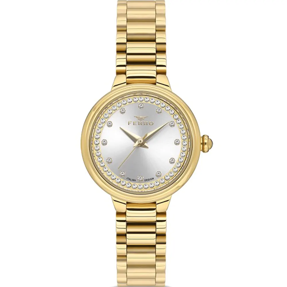 Ferro FL21493A-B Metal Band Women Watch. The case is made out of gold super metal with a gold bezel, which stands for the high quality of the item, it has a white color dial. This model has got 30 meters of water resistance. it can be worn in scenarios where it is likely to be splashed but not immersed in water and will be fine in rain. The watch is shipped with an original box and a guarantee from the manufacturer.