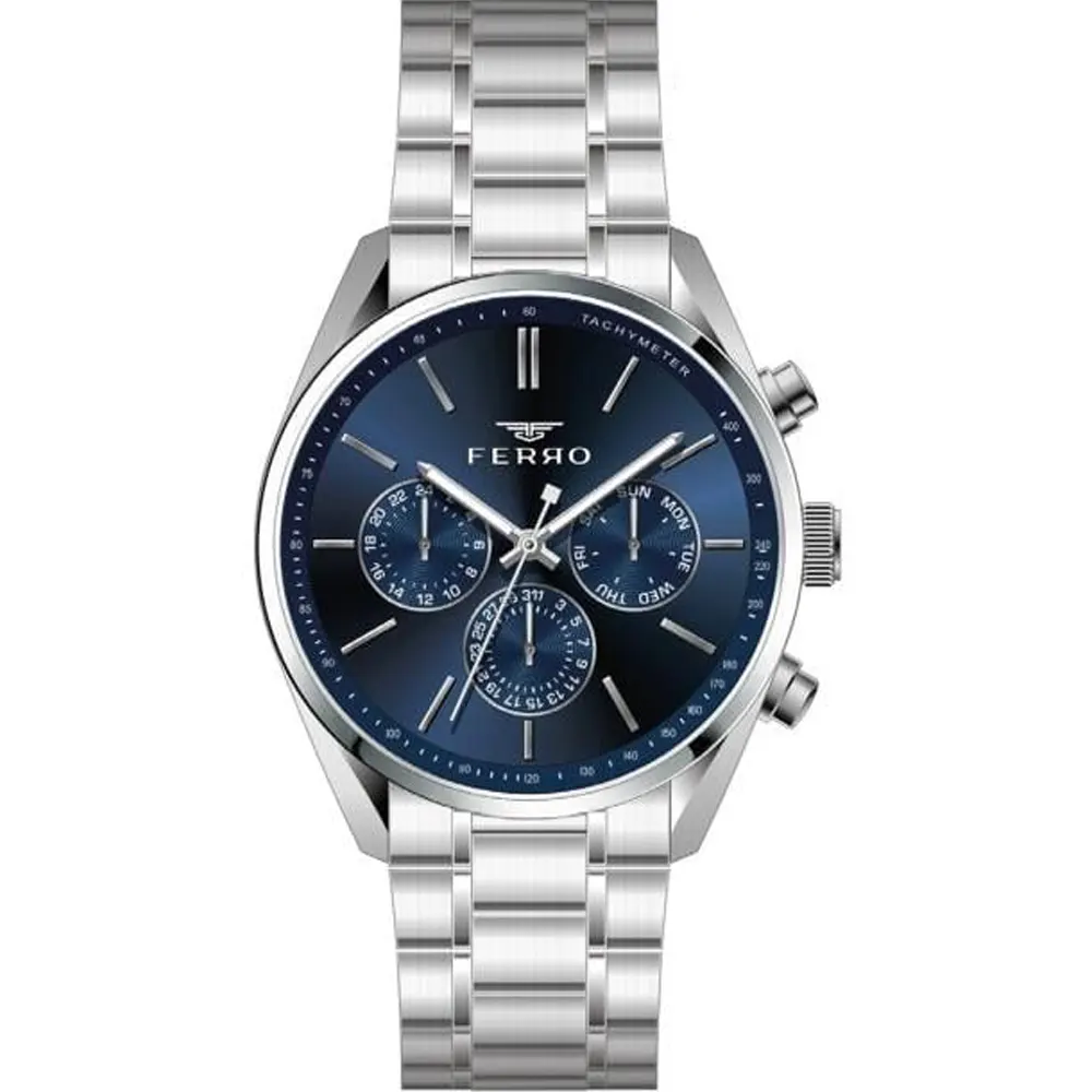 Ferro FM11463A-A3 Metal Band Men Watch. The case is made out of silver super metal with silver bezel, which stands for the high quality of the item, it has a blue color dial. This model has got 30 meters of water resistance. it can be worn in scenarios where it is likely to be splashed but not immersed in water and will be fine in rain. The watch is shipped with an original box and a guarantee from the manufacturer.