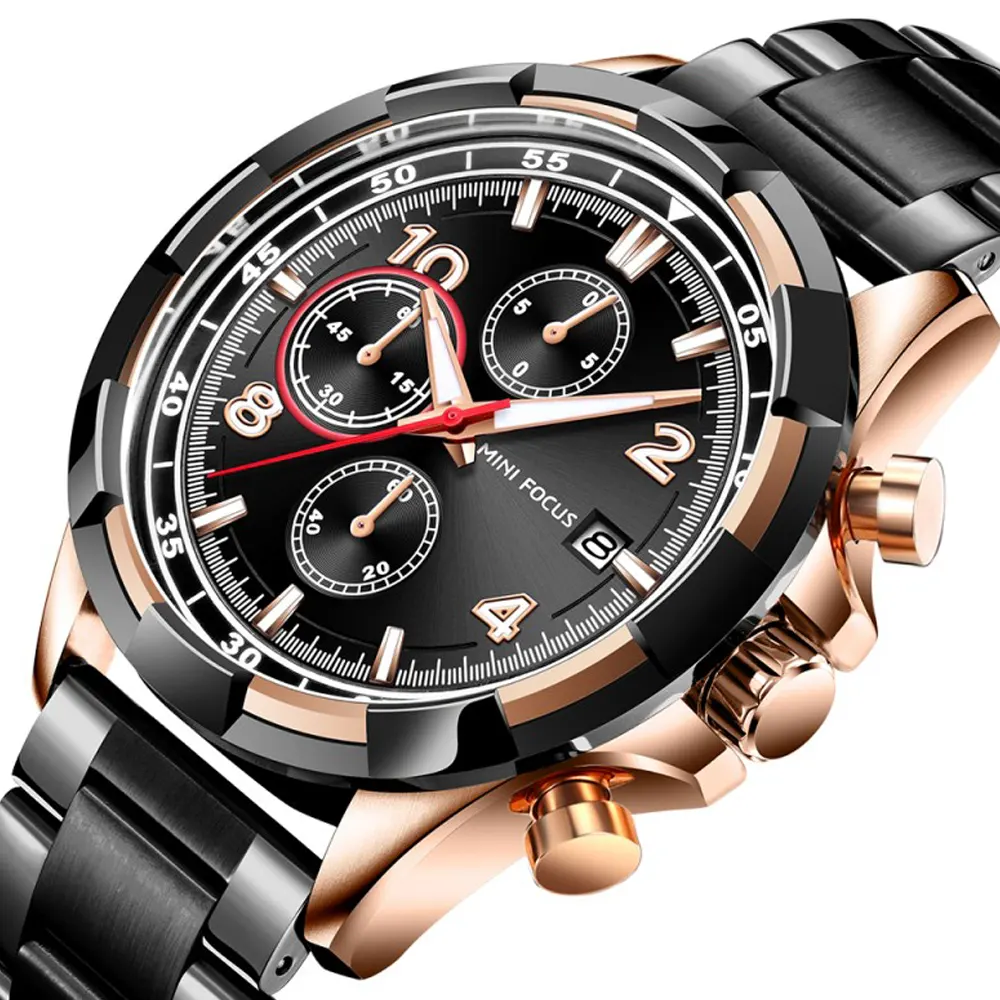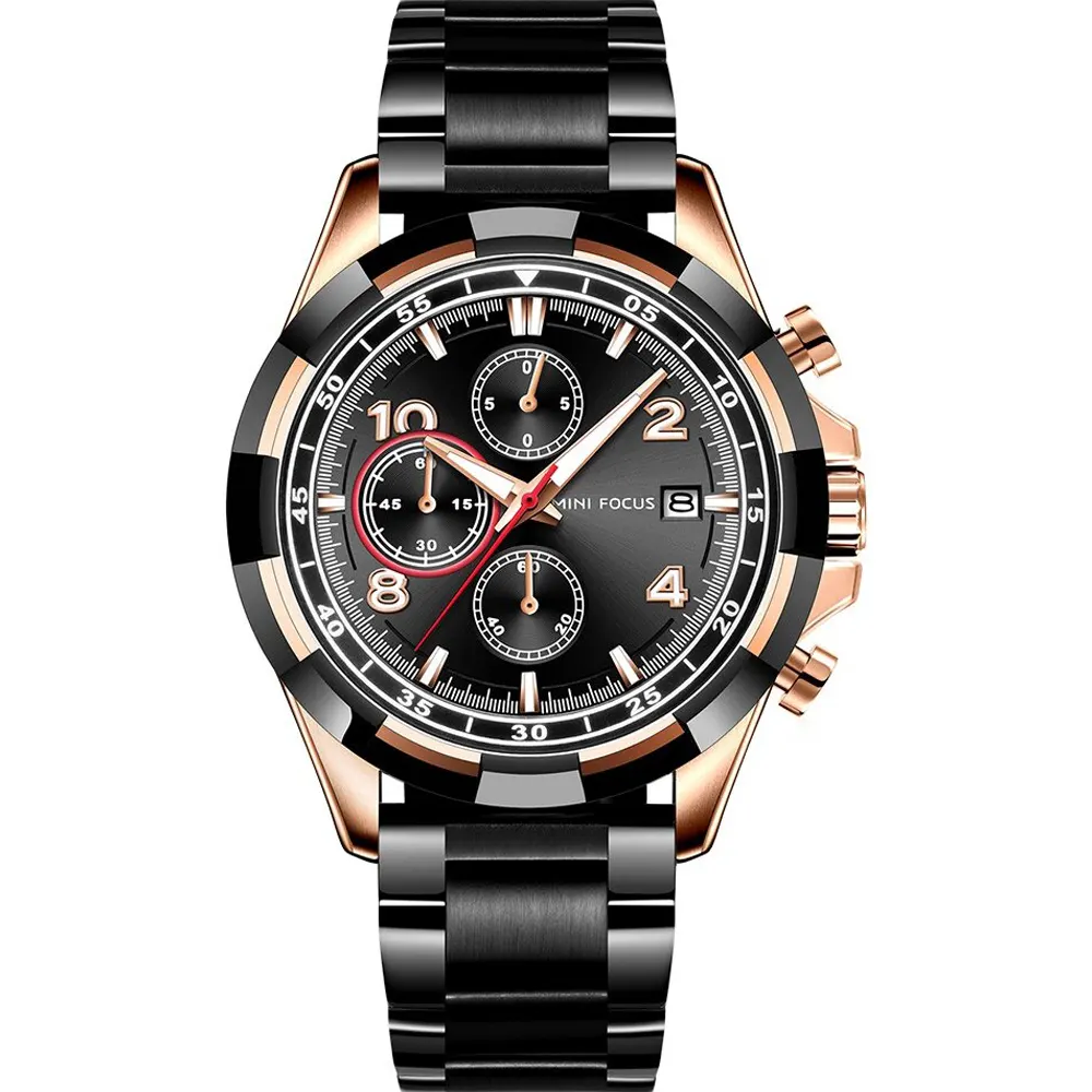 Mini Focus MF0198G-02 Metal Band Men Watch. The case is made out of rose gold alloy with a rose gold and black bezel, which stands for the high quality of the item, it has a black color dial. This model has got 30 meters of water resistance. it can be worn in scenarios where it is likely to be splashed but not immersed in water and will be fine in rain. The watch is shipped with an original box and a guarantee from the manufacturer.
