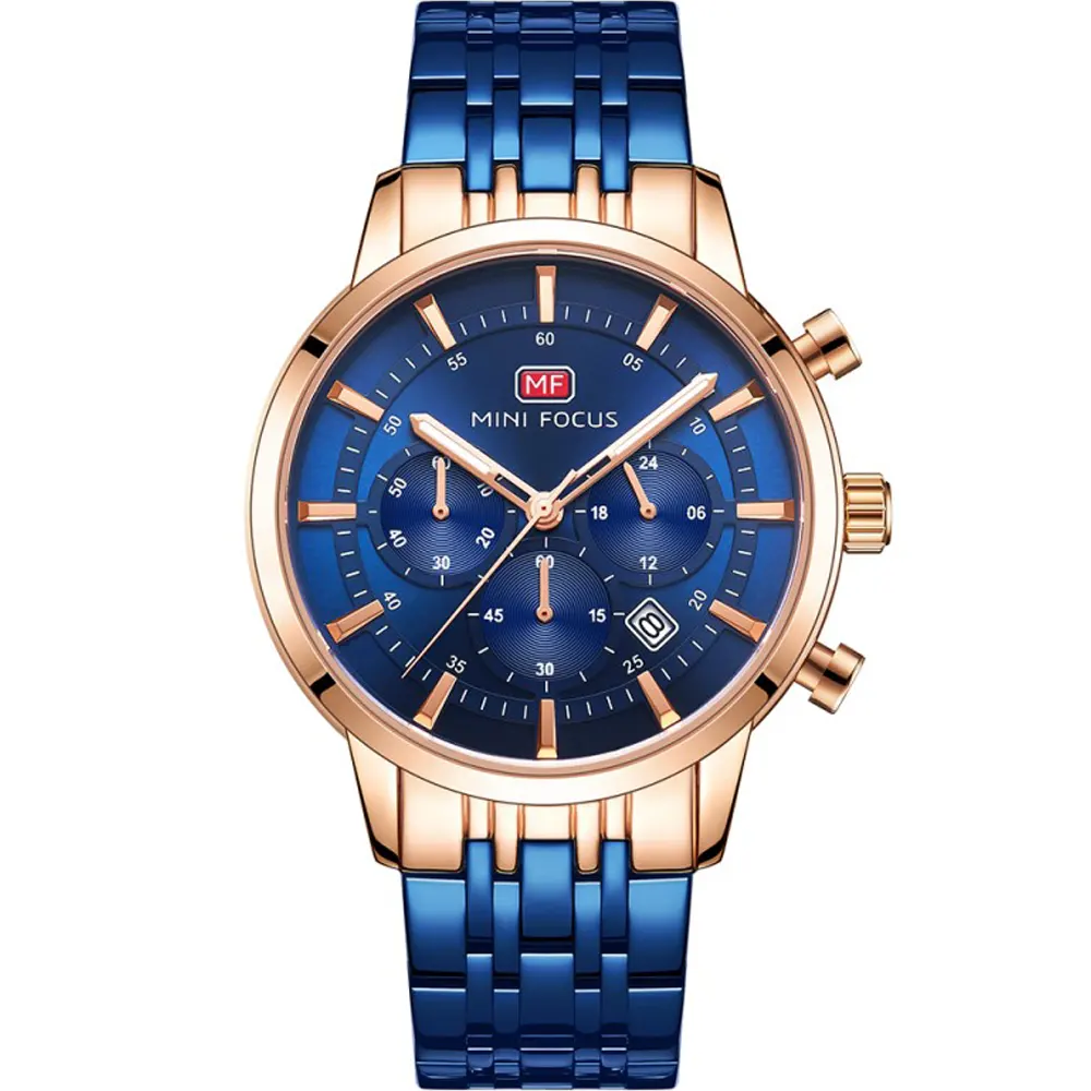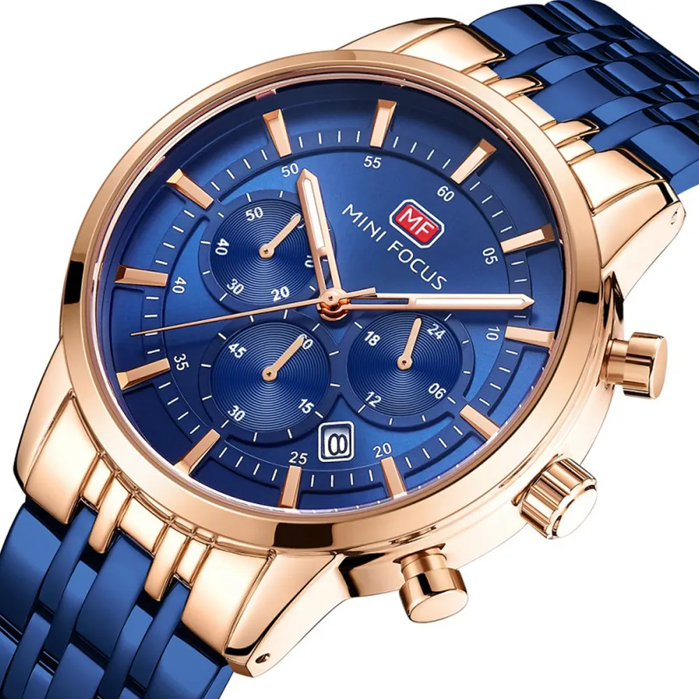Mini Focus MF0282G-02 Metal Band Men Watch. The case is made out of rose gold alloy with a rose gold bezel, which stands for the high quality of the item, it has a blue color dial. This model has got 30 meters of water resistance. it can be worn in scenarios where it is likely to be splashed but not immersed in water and will be fine in rain. The watch is shipped with an original box and a guarantee from the manufacturer.