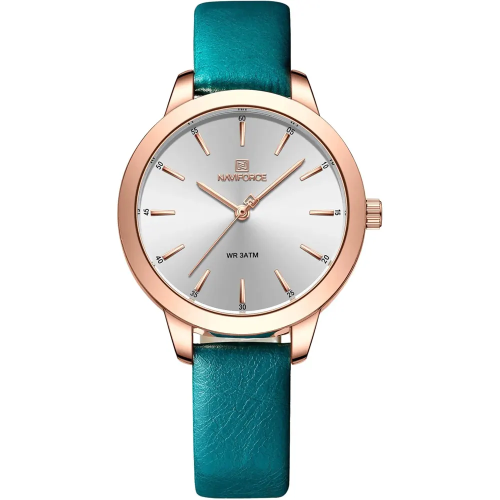 NaviForce NF5024L-RS-GRN-WHT Leather Band Women Watch. The case is made out of rose gold alloy with a rose gold bezel, which stands for the high quality of the item, it has a white color dial. This model has got 30 meters of water resistance. it can be worn in scenarios where it is likely to be splashed but not immersed in water and will be fine in rain. The watch is shipped with an original box and a guarantee from the manufacturer.