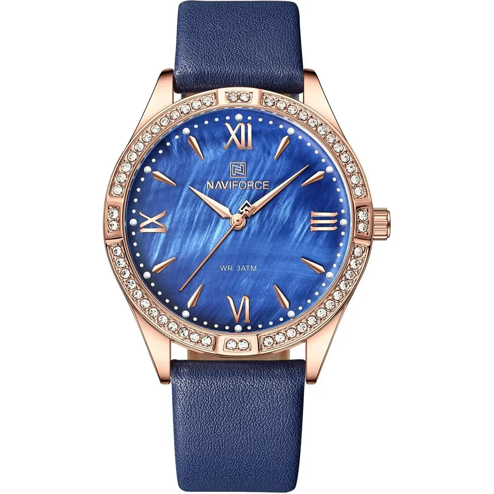 NaviForce NF5038-RS-BLU Leather Band Women Watch. The case is made out of rose gold alloy with a rose gold bezel, which stands for the high quality of the item, it has a blue color dial. This model has got 30 meters of water resistance. it can be worn in scenarios where it is likely to be splashed but not immersed in water and will be fine in rain. The watch is shipped with an original box and a guarantee from the manufacturer.