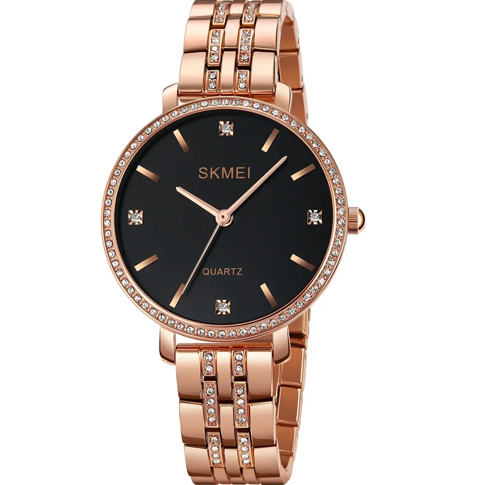 Skmei 2006-L-RS-BLK Metal Band Women Watch. The case is made out of rose gold alloy with a rose gold bezel, which stands for the high quality of the item, it has a black color dial. This model has got 30 meters of water resistance. it can be worn in scenarios where it is likely to be splashed but not immersed in water and will be fine in rain. The watch is shipped with an original box and a guarantee from the manufacturer.
