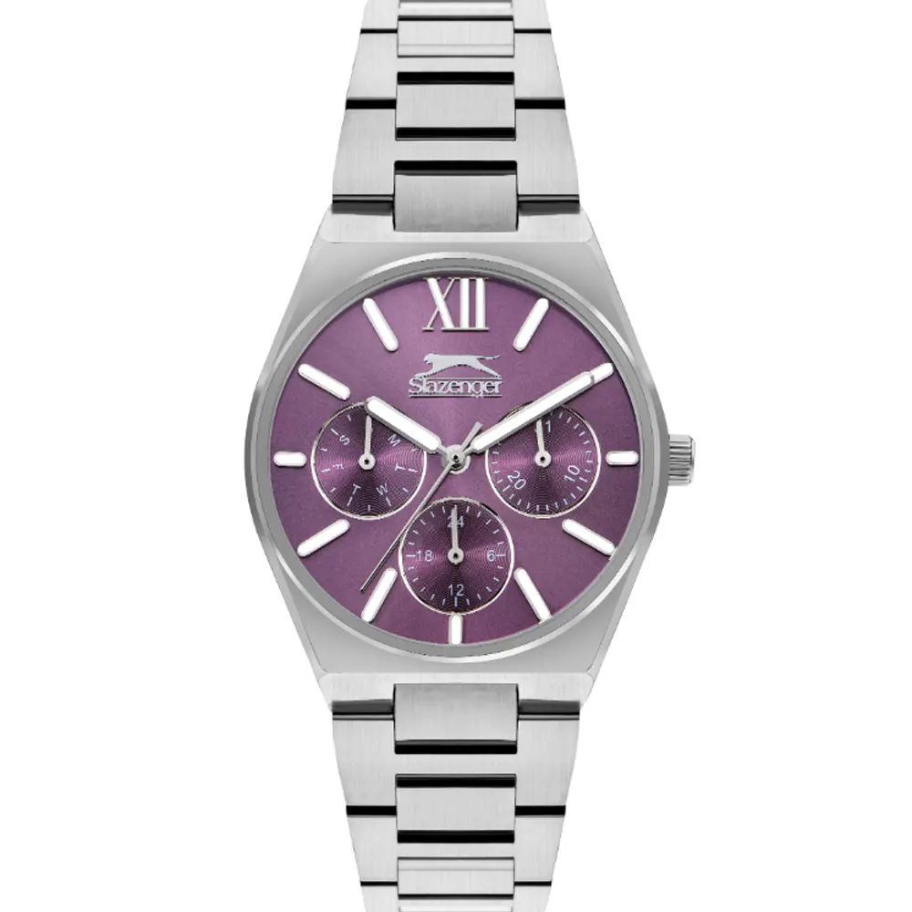 Slazenger SL.9.2243.4.08 Metal Band Women Watch. The case is made out of silver brass with a silver bezel, which stands for the high quality of the item, it has a purple color dial. This model has got 30 meters of water resistance. it can be worn in scenarios where it is likely to be splashed but not immersed in water and will be fine in rain. The watch is shipped with an original box and a guarantee from the manufacturer.