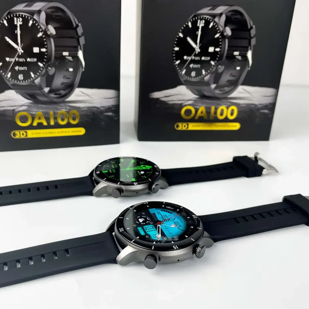Smartwatch OA100. The case is made out of alloy with black bazel, which stands for the high quality of the item, it has a amoled LCD dial. This model has got IP68 meters of water resistance. it can be worn in scenarios where it is likely to be splashed but not immersed in water and will be fine in rain. The watch is shipped with an original box.